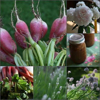 | Clockwise from top left: Radishes from the garden, Peonies from the garden on kitchen table, Rhubarb chutney, Chive blossoms, Lavender ready to bloom, Rhubarb for chutney |